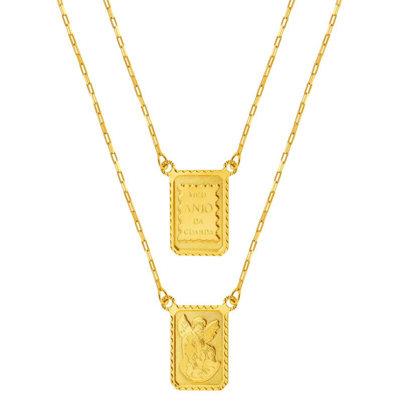 O Escapulário tem a imagem a laser do Anjo da guarda e o escrito Meu Anjo da Guarda. Feito em Ouro 18k.