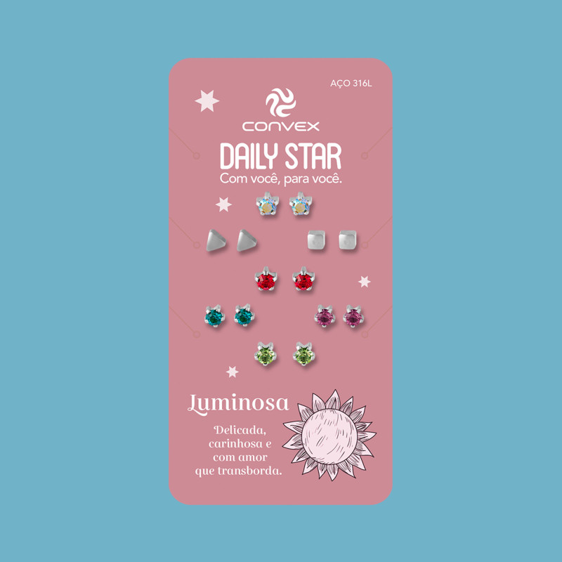 Luminosa é a cartela de Brincos Daily Star feita para as que amam joias delicadas, que são carinhosas e transbordam amor! Os brincos são delicados, feitos em Aço 316L, que é hipoalergênico e inoxidável, conferindo durabilidade e brilho a joia, podem ser utilizados tanto no primeiro quanto no segundo furo.