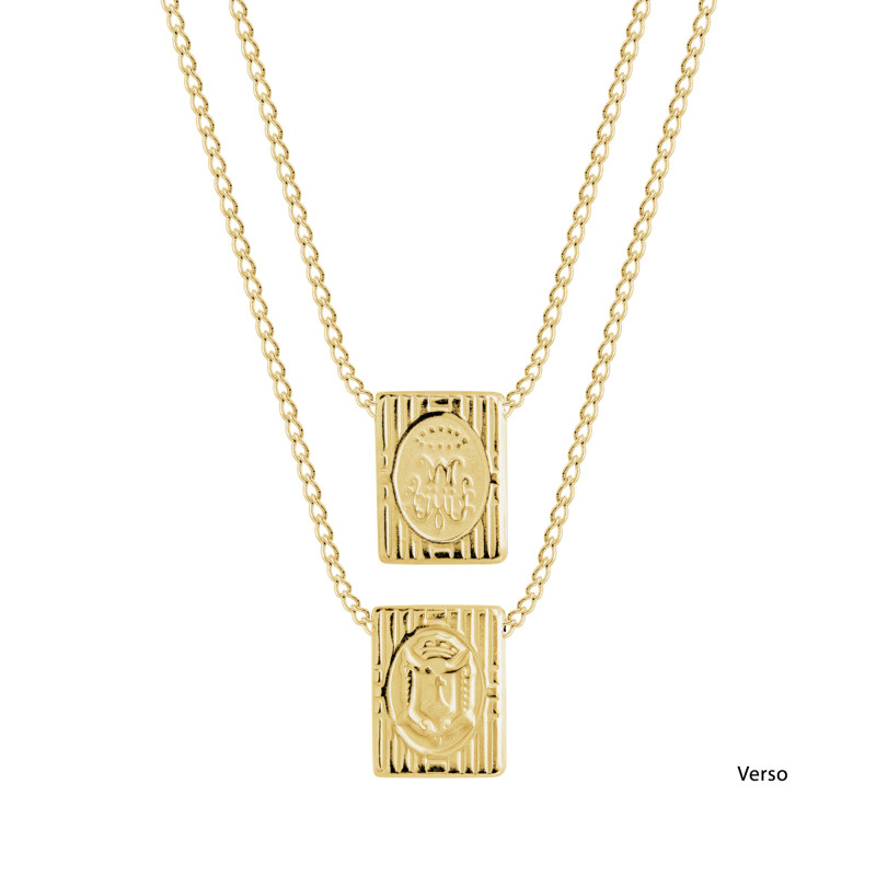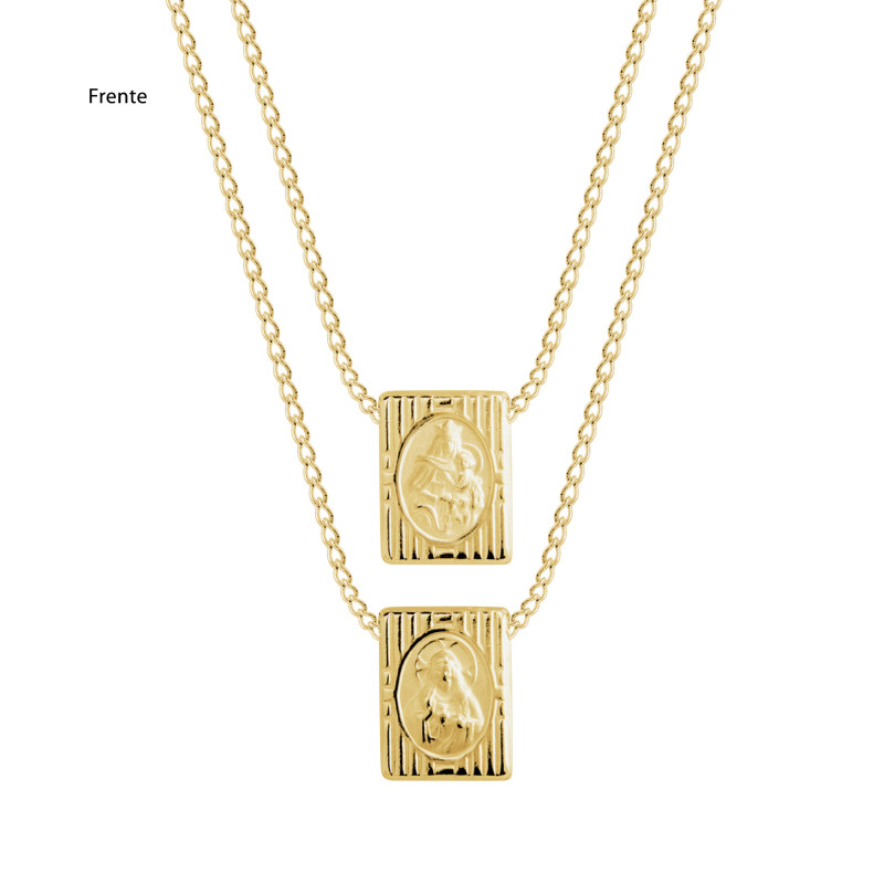 Escapulários Duplos são diferentes, eles possuem duas correntes em cada lado, com um design úncio, que confere modernidade nesse clássico das joias religiosas.