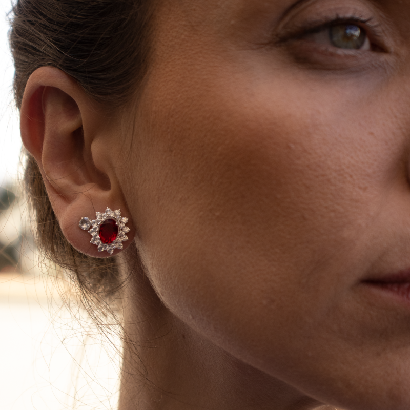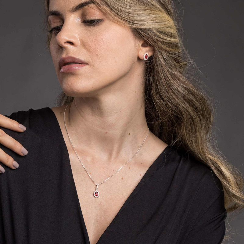 Pedras: 16 Zircônias Brancas de 1,25mm e 1 Cristal Oval Rubi 5x7mm
