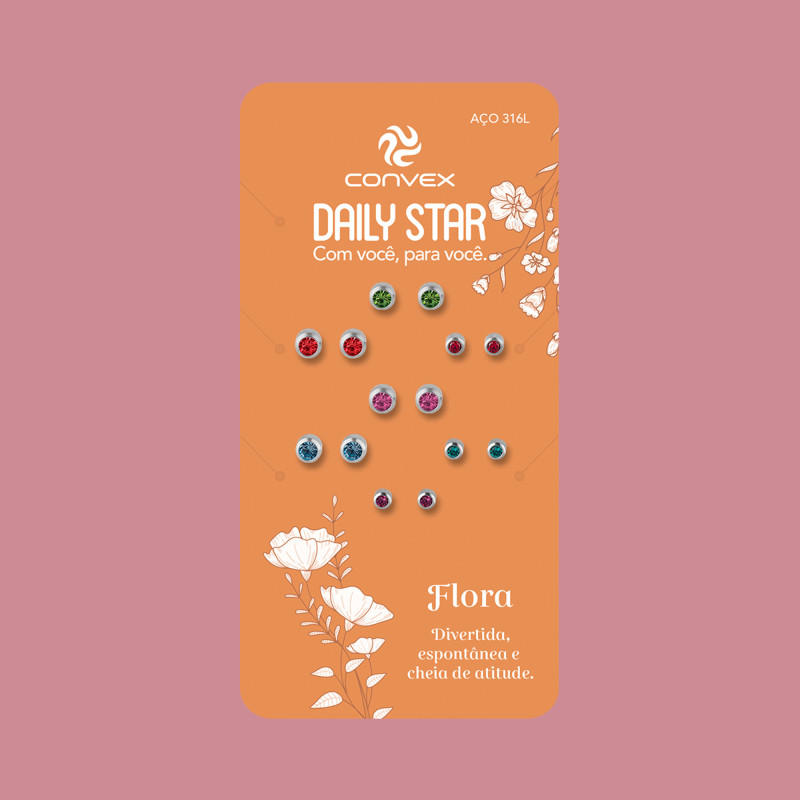 Flora é a cartela de Brincos Daily Star que encanta quem ama se divertir, é espontânea e cheia de atitude! Os brincos são delicados, feitos em Aço 316L, que é hipoalergênico e inoxidável, conferindo durabilidade e brilho a joia, podem ser utilizados tanto no primeiro quanto no segundo furo.