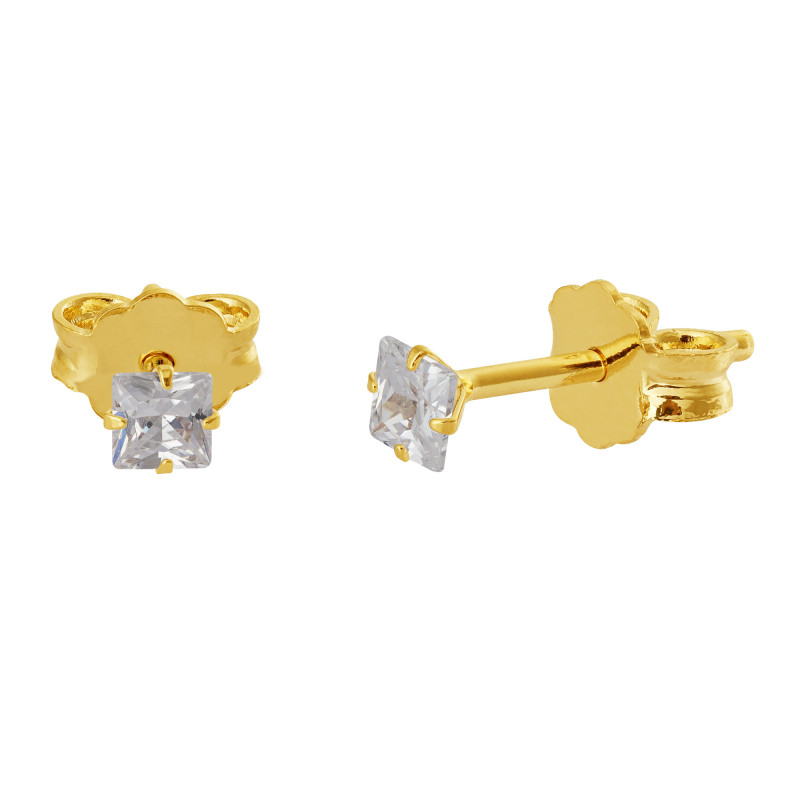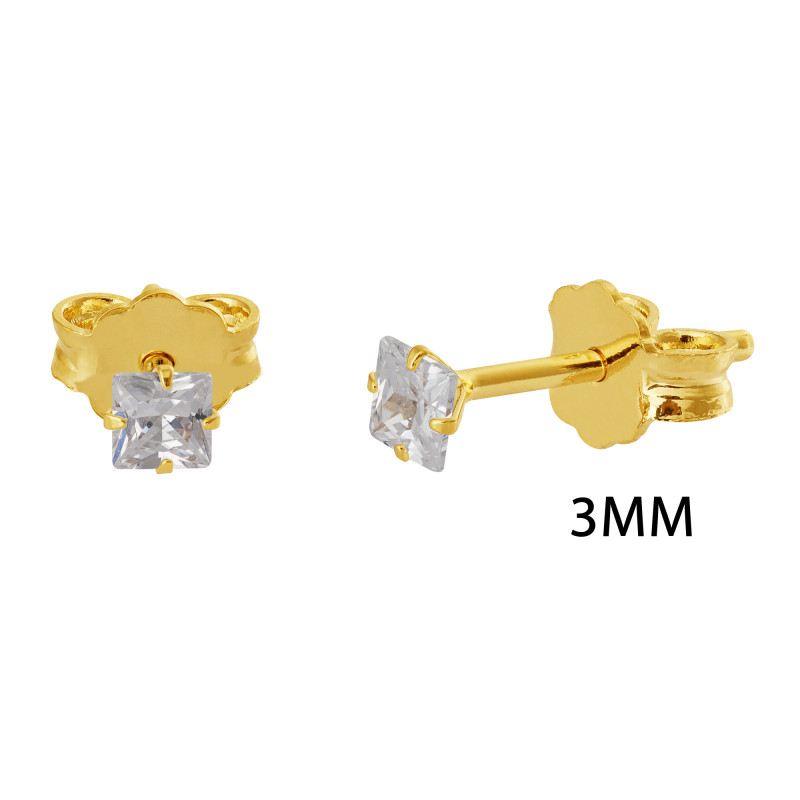 Brinco de Prata Solitário Zircônia Branca Carré Revestido com Ouro 18k 3mm