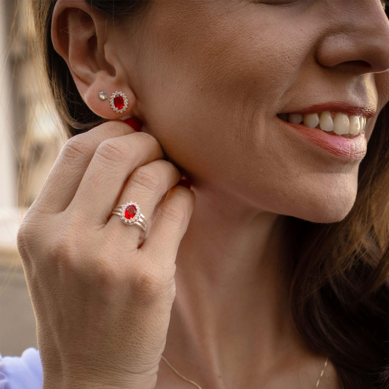 Anel de Prata Coleção Queens Cristal Rubi 5x7 e Zircônias Brancas