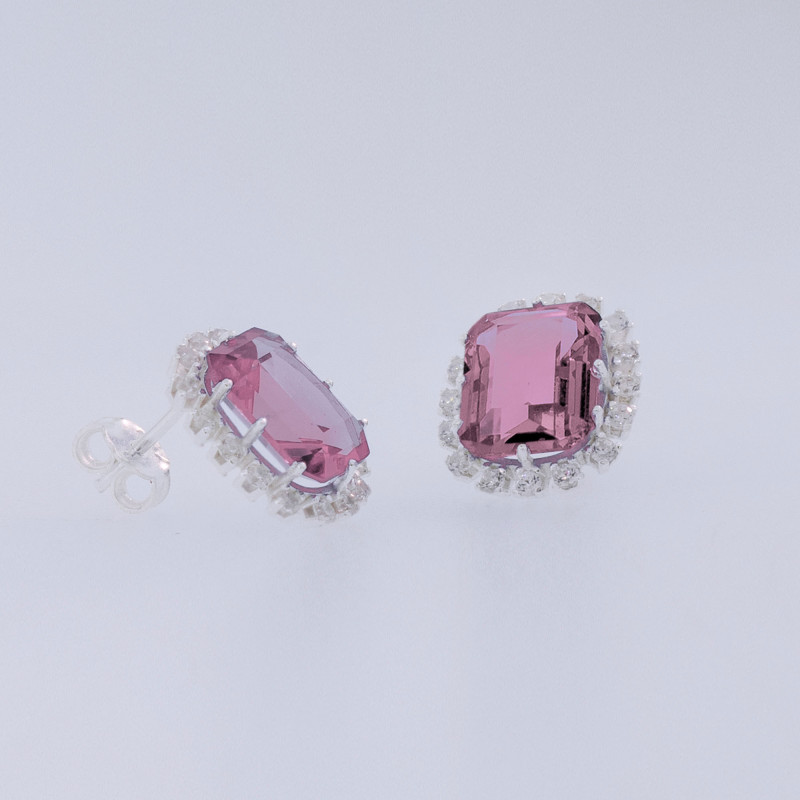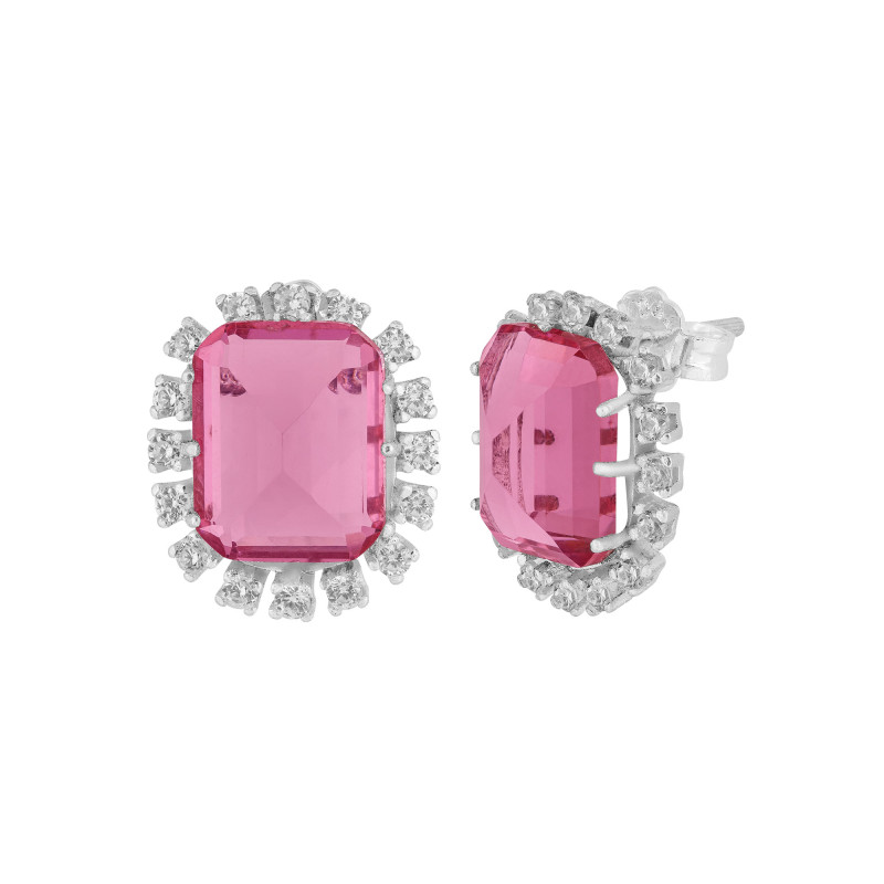 Brinco de Prata Coleção Queens Cristal Safira Rosa 8x10 e Zircônias Brancas