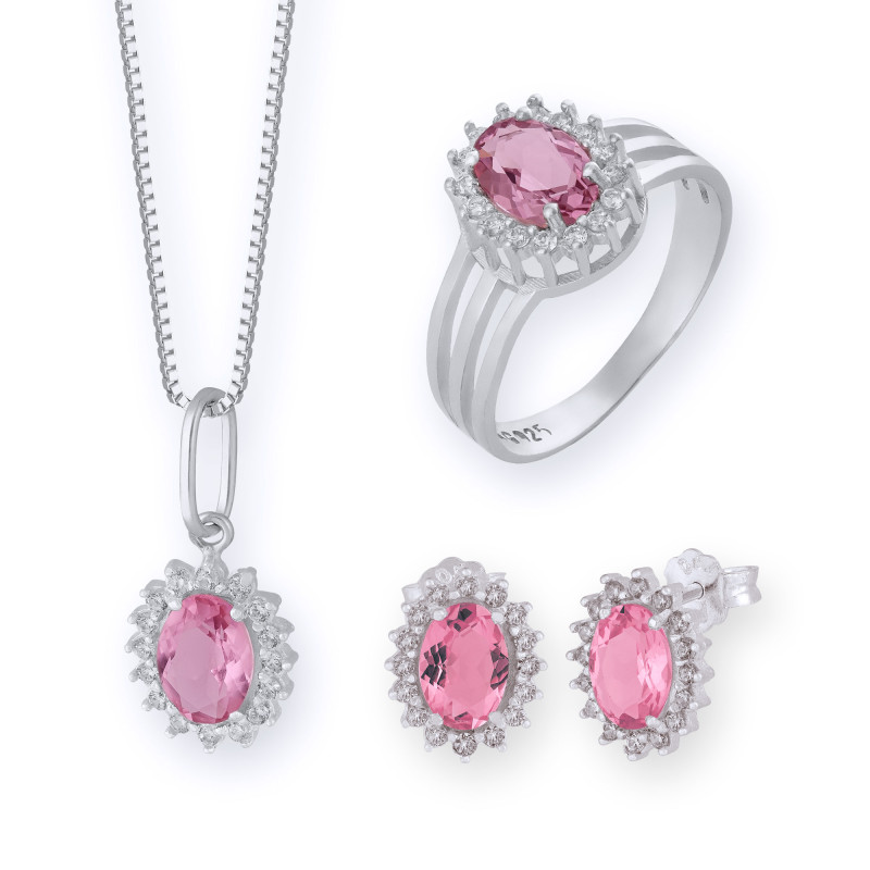 01 - Colar Veneziana 45cm com Pingente Oval 5x7 Safira Rosa e 16 Zircônias Brancas1.25mm