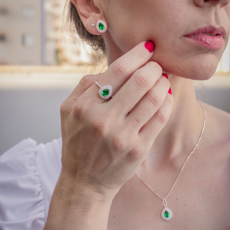Conjunto de Prata Coleção Queens Cristal Esmeralda