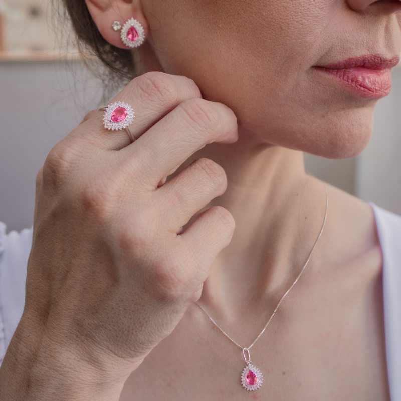 Conjunto de Prata Coleção Queens Cristal Safira Rosa