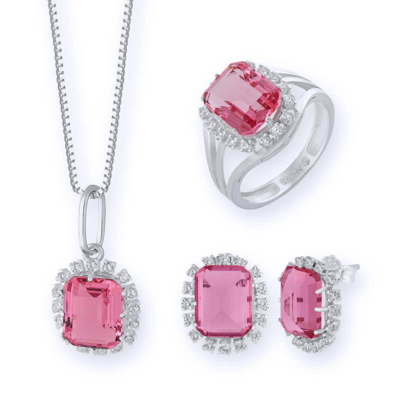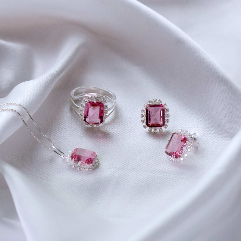Conjunto de Prata Coleção Queens Cristal Safira Rosa