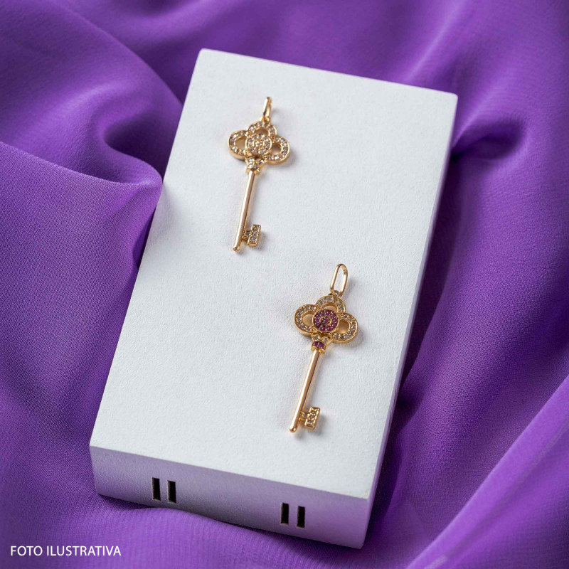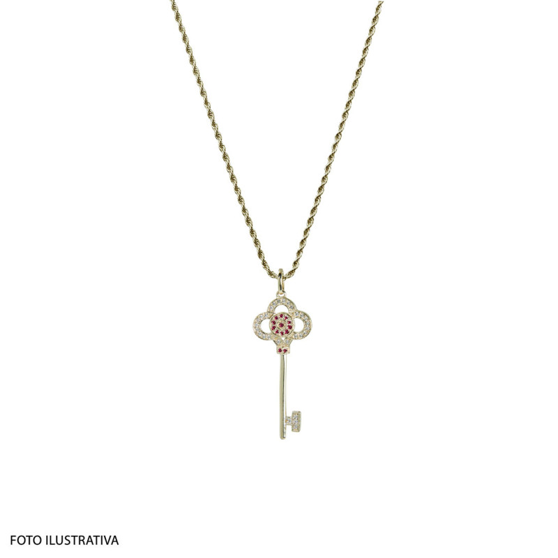 Pingente em Prata Revestido com Ouro 18K Chave com Zircônia Vermelha 37x15mm