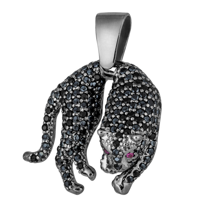 Pingente de Prata Pantera Negra cravejado de Zircônias negras e Ródio olho vermelho 19x16mm