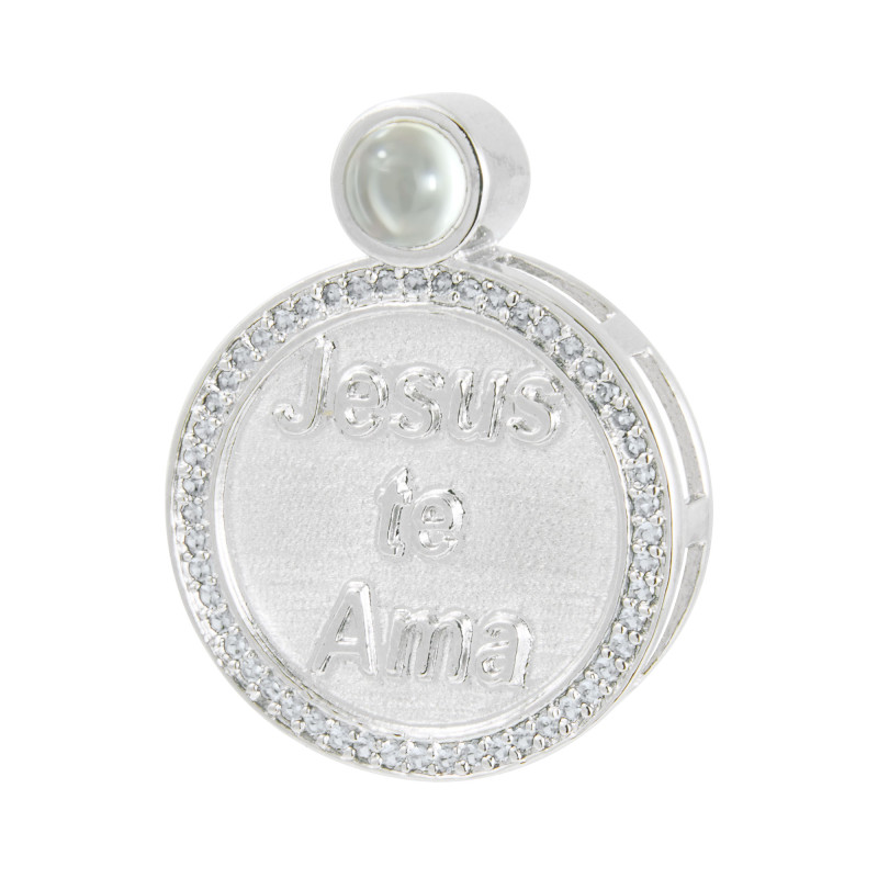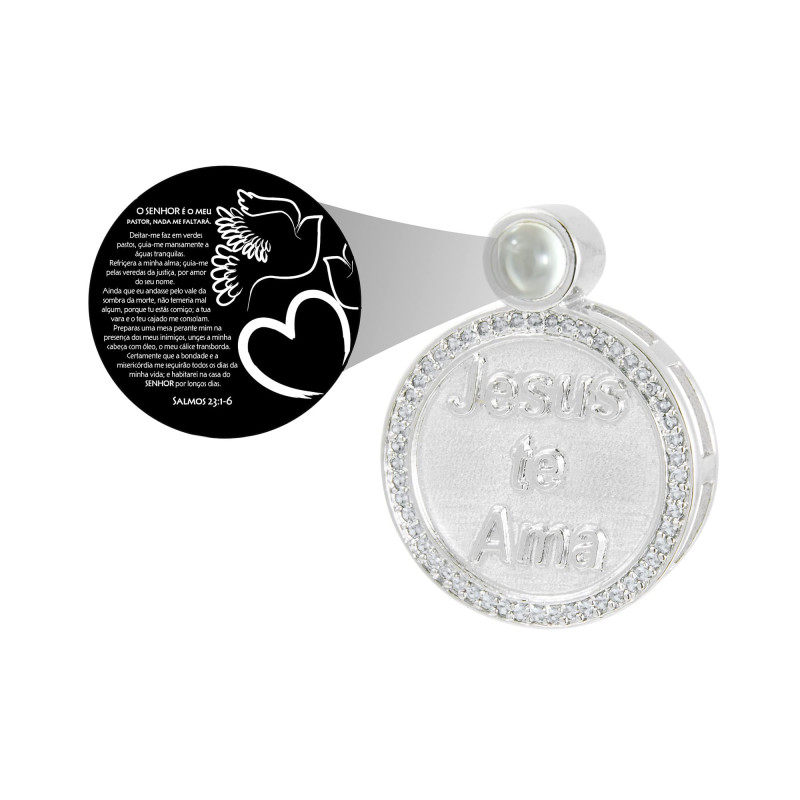 Pingente Prata com Rodio Neo Crystal Círculo Jesus Te Ama com Zircônias Brancas 28x22mm, com Oração