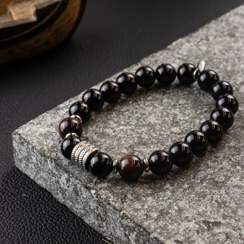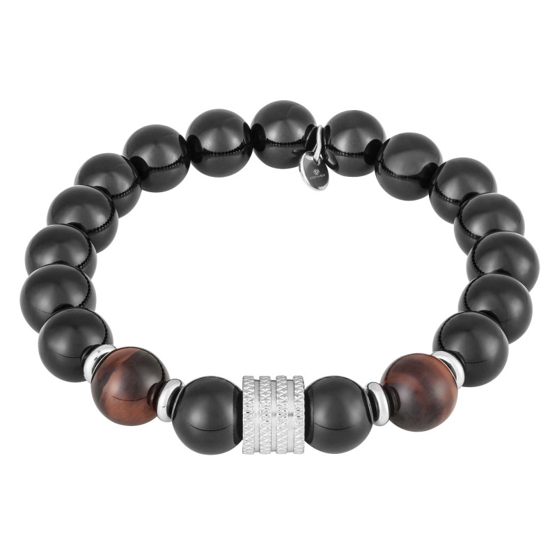 Pulseira Nordic Ragnar Pedra Ágata Negra e Olho de Tigre 10mm Aço com fio de silicone 22cm