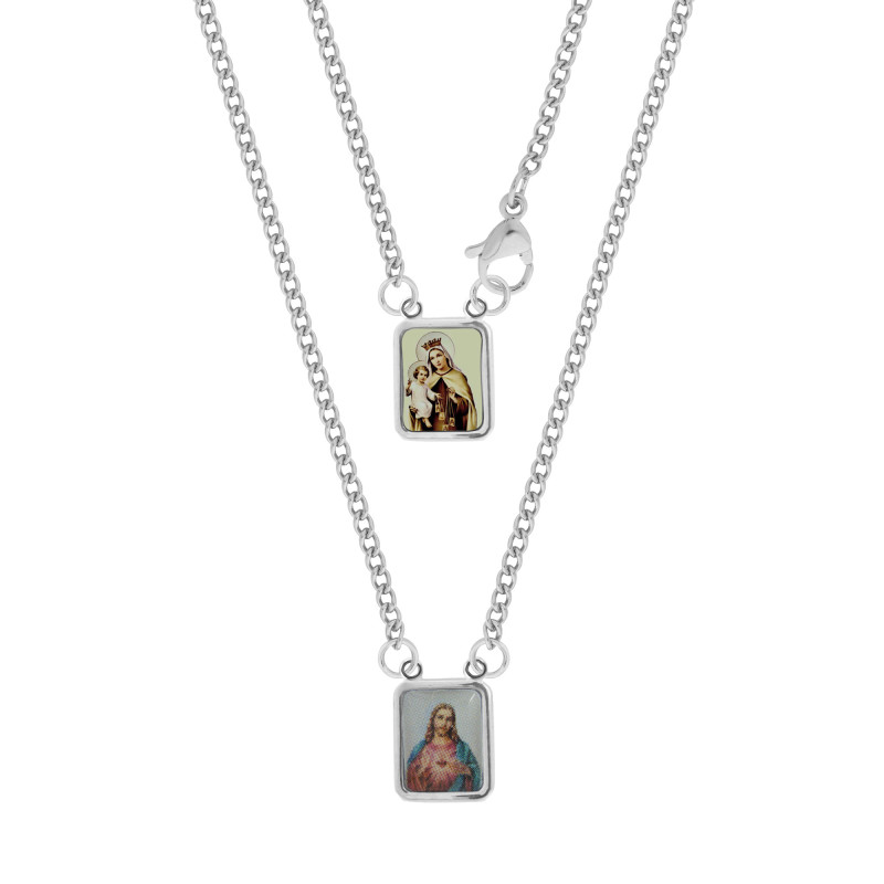 Escapulário em Aço com Resina Nossa Sra. do Carmo e Sagrado Coração de Jesus 11x9mm 60cm