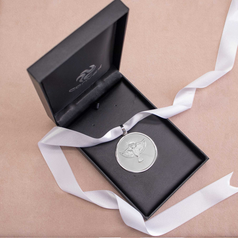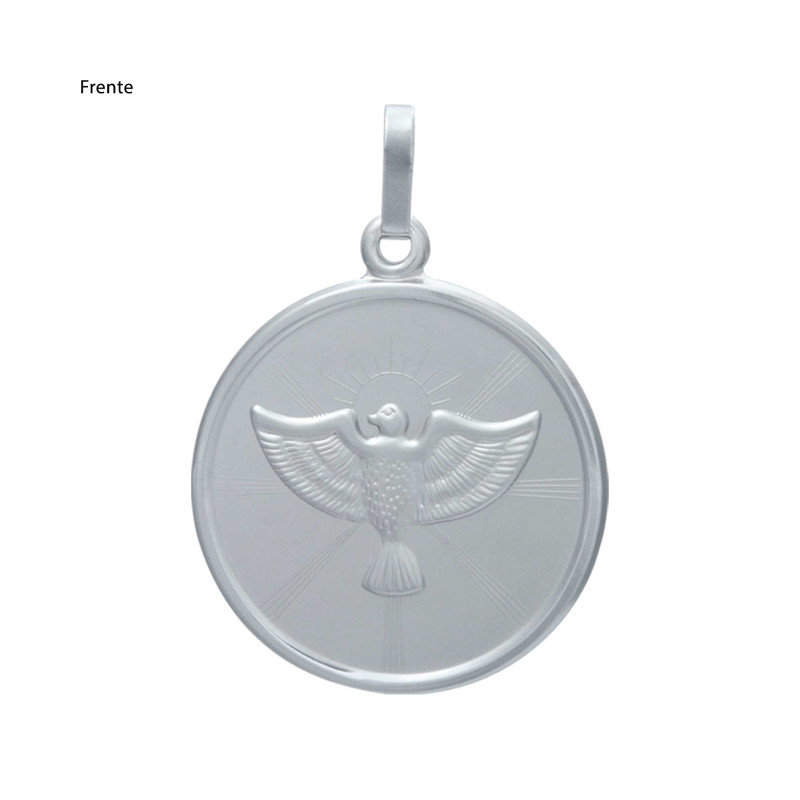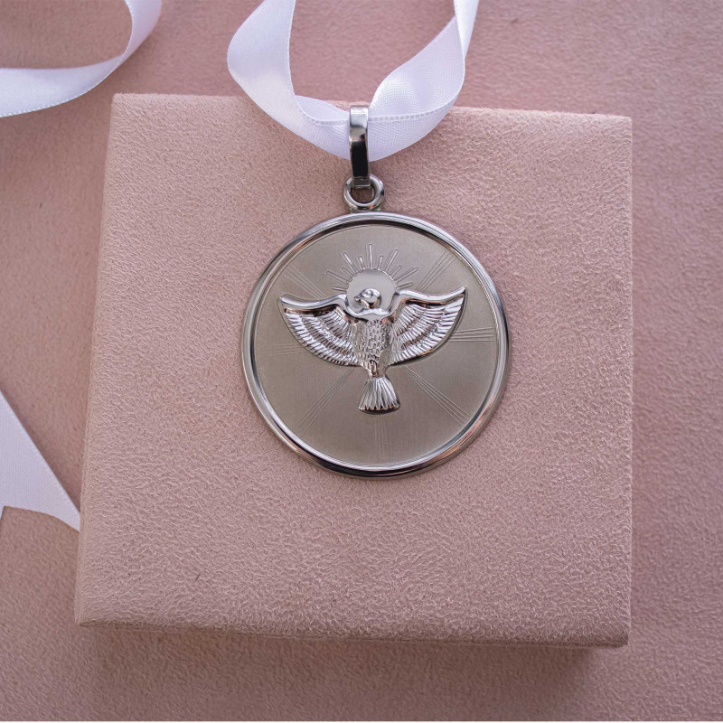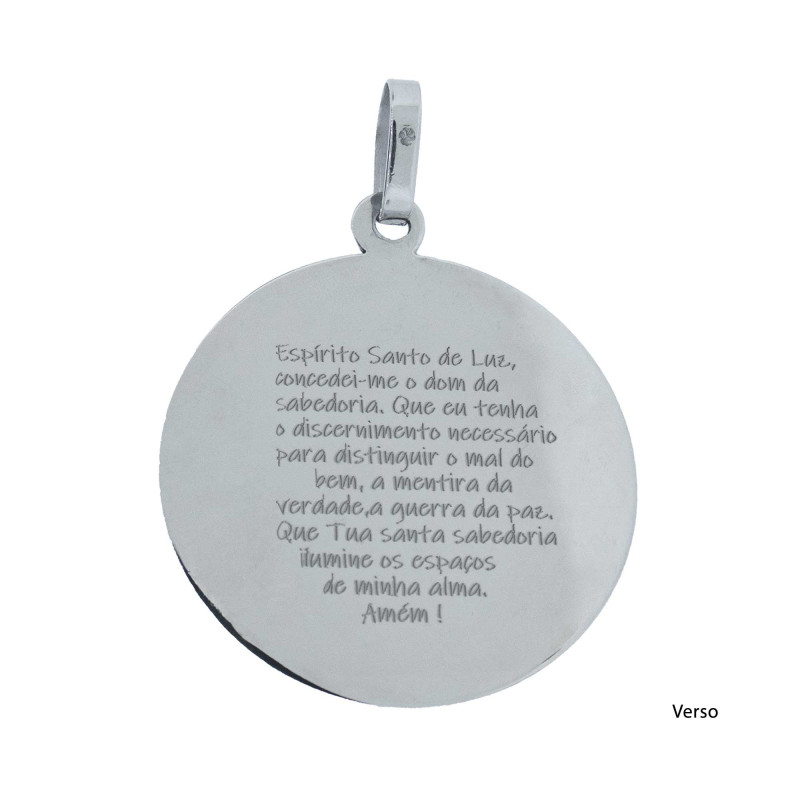 A Medalha de Berço de Aço Espírito Santo acompanha estojo e fita branca, é feita em Aço 316L polido com fundo em Aço escovado, deixando a medalha muito mais bonita. No verso traz a Oração do Espírito Santo.