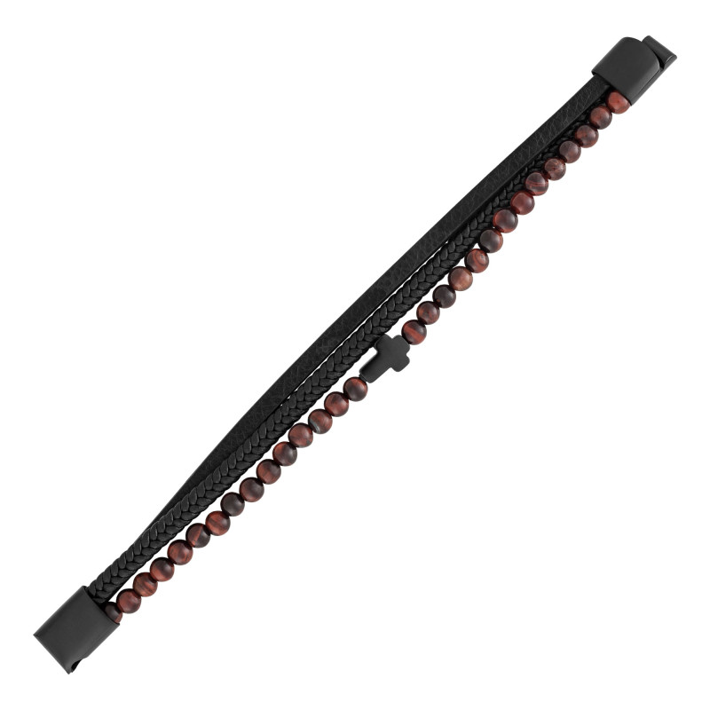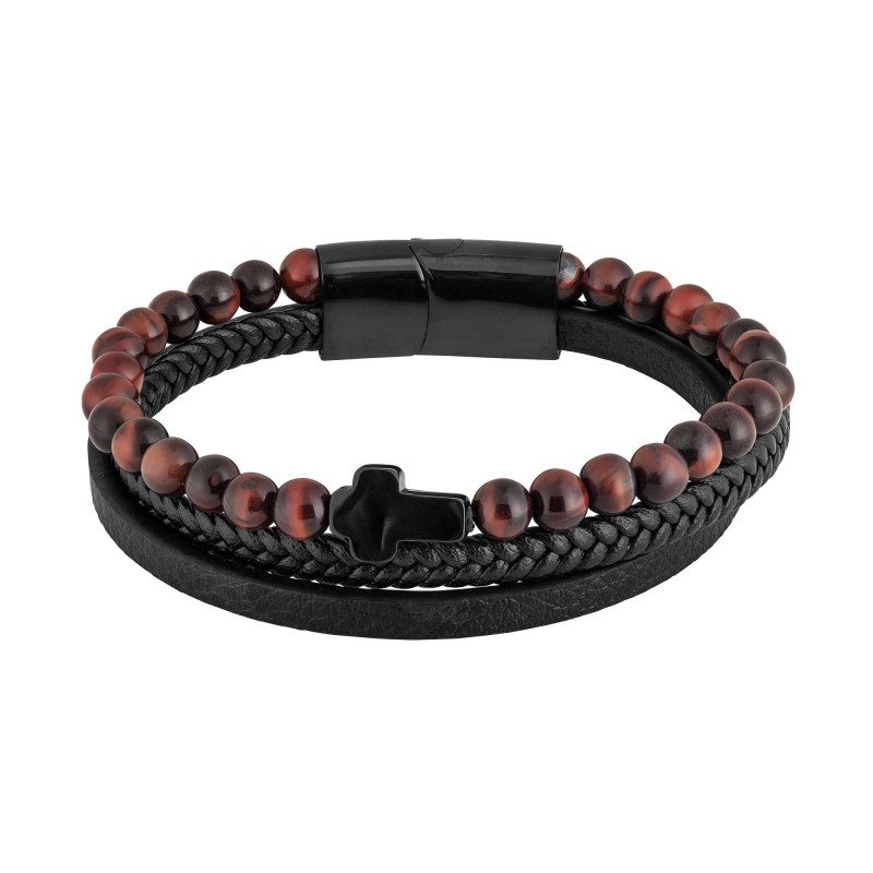 Pulseira de Aço Eclipse Couro e Pedras Olho de Tigre